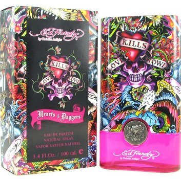 The collection includes fragrances Ed Hardy Hearts & Daggers for Her and Ed Hardy Hearts & Daggers for Him which arrived on the market in November 2009. Their pink and bluish flacons feature an interesting stopper decorated with tattoo applications.